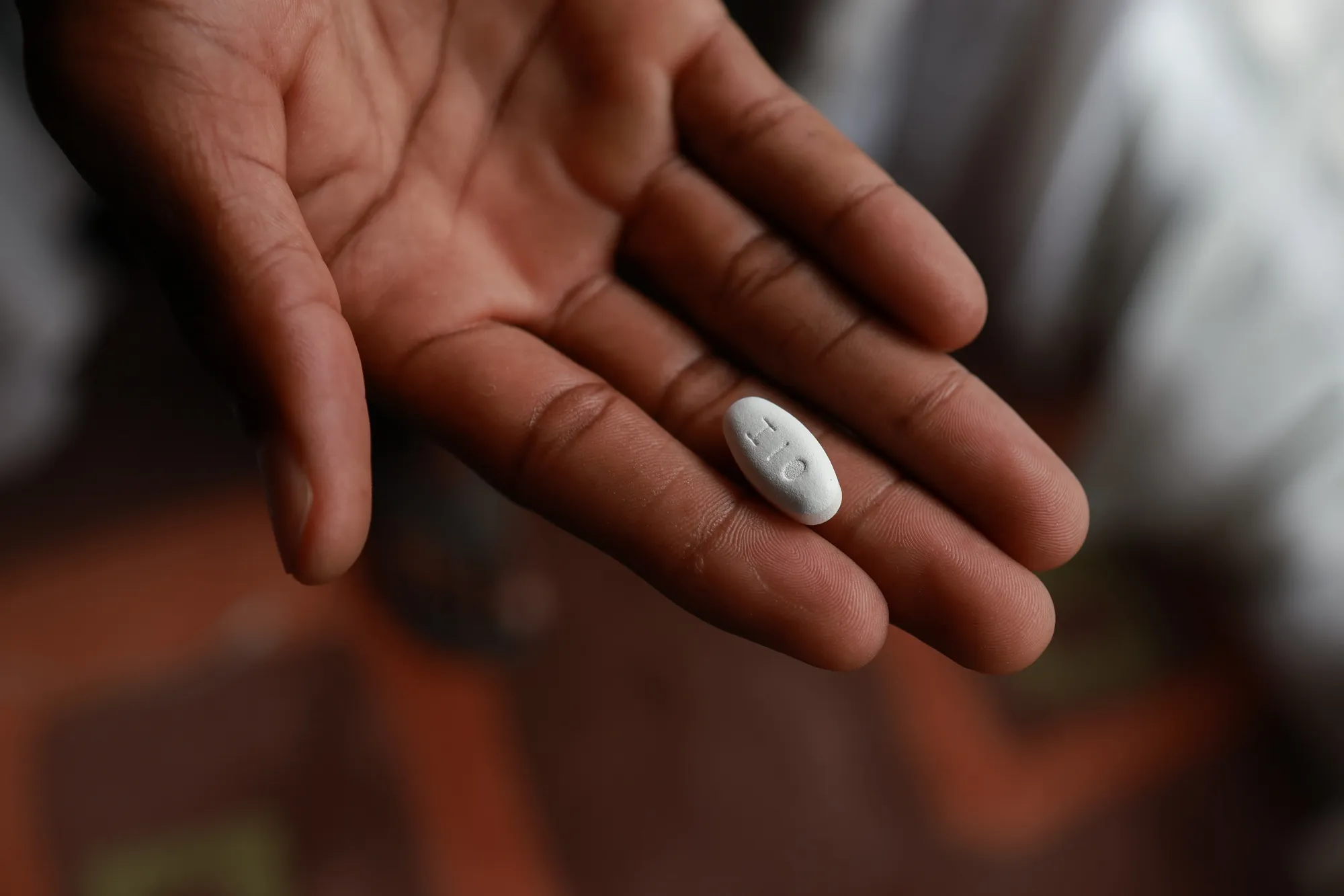 南非姆邦貝拉,一名患者手持用於治療HIV感染的藥物。