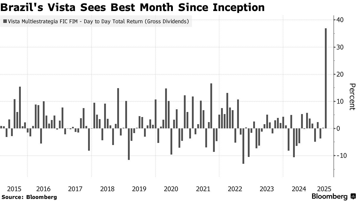 該公司的Vista多策略基金在上個月扣除費用後上漲37%,表現優於彭博追蹤的53只同類產品。Anbima對沖基金指數IHFA則創下至少2007年底以來最大單月漲幅。