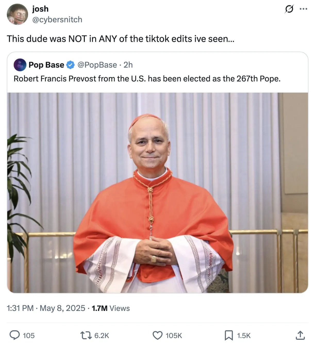 今天下午當我看到辦公桌上即時煙囱攝像頭冒出白煙時,我認為有兩種可能:要麼迎來一位覺醒派教皇——塔格萊或祖皮——讓TikTok蜂羣沸騰,要麼是保守派教皇,瞬間讓氛圍凝重。但我沒料到第三種可能:一位被非正式稱為"鮑勃"的美國教皇。
