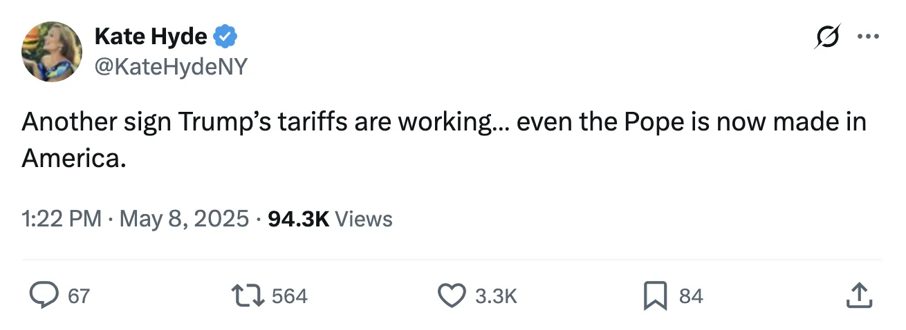 但轉念一想…或許特朗普正歡欣鼓舞?畢竟,一位美國製造的教皇確實讓他的貿易戰看起來取得了實質性成果。