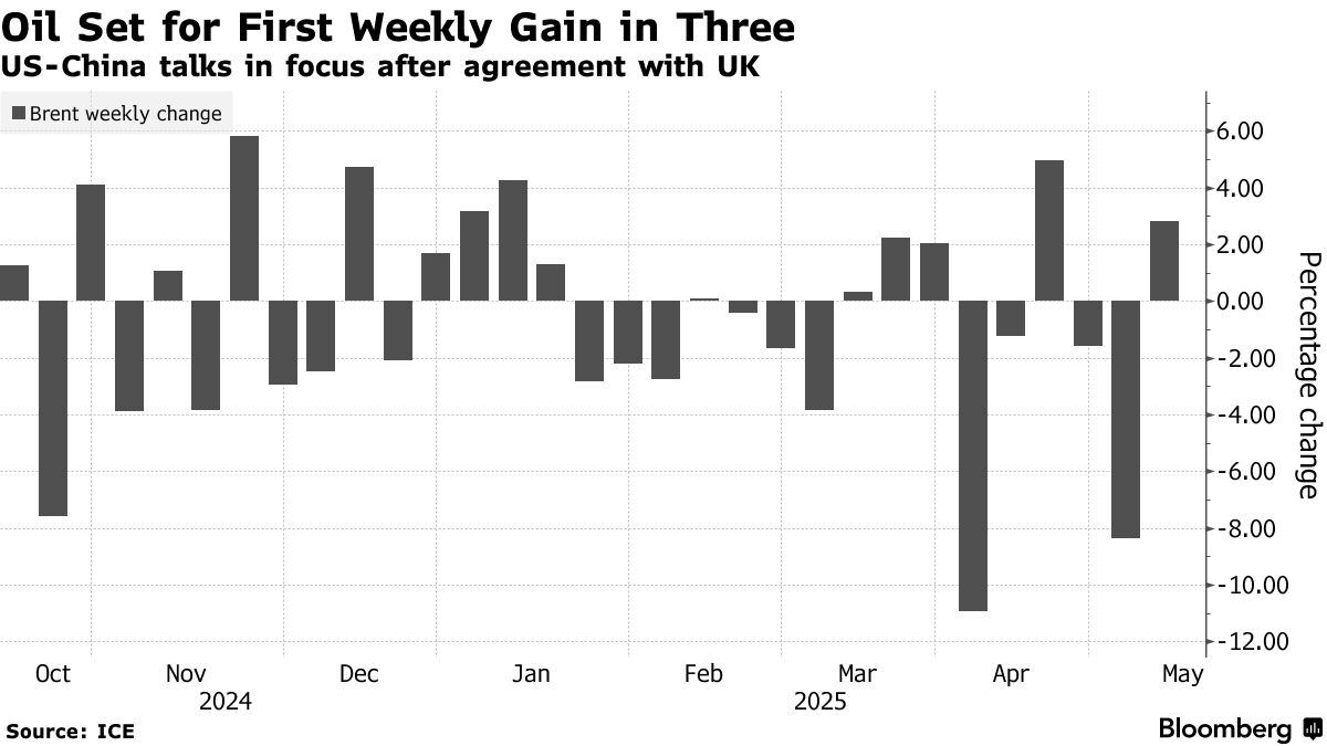在美國總統唐納德·特朗普宣佈與英國達成協議後,石油價格保持上漲,市場將注意力轉向本週末中美貿易談判。