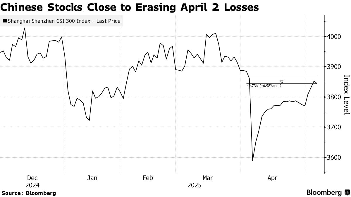 週五早盤,境內基準滬深300指數收跌0.2%,香港上市中資企業指數下跌0.3%。儘管出現波動,兩大指數仍接近收復自上月初特朗普總統宣佈對中國商品徵收高達145%關税以來的跌幅。