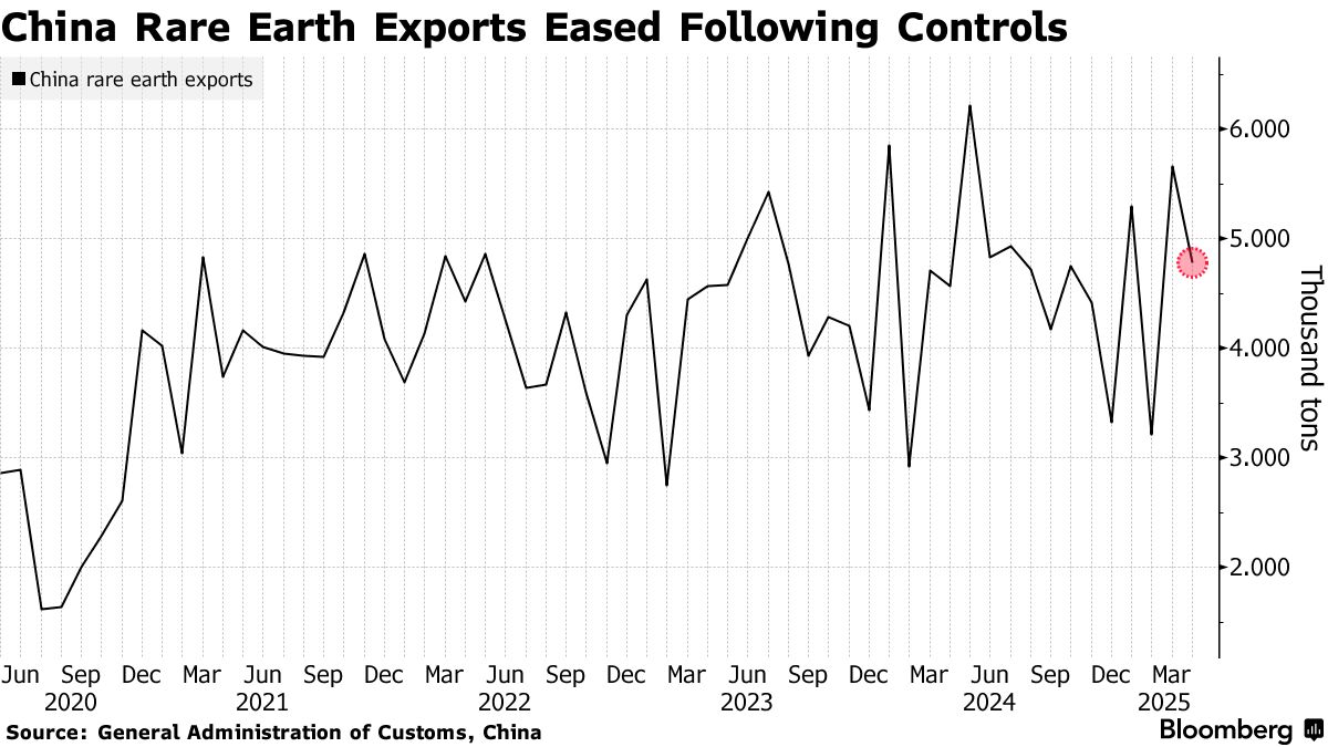 稀土共包含17種元素,為反制特朗普政府不斷加碼的懲罰性關税,北京於4月初將其中7種納入出口管制清單。這一限制中國主導材料供應的最新舉措,可能危及對高科技製造和國防至關重要的全球供應鏈。限制供應。