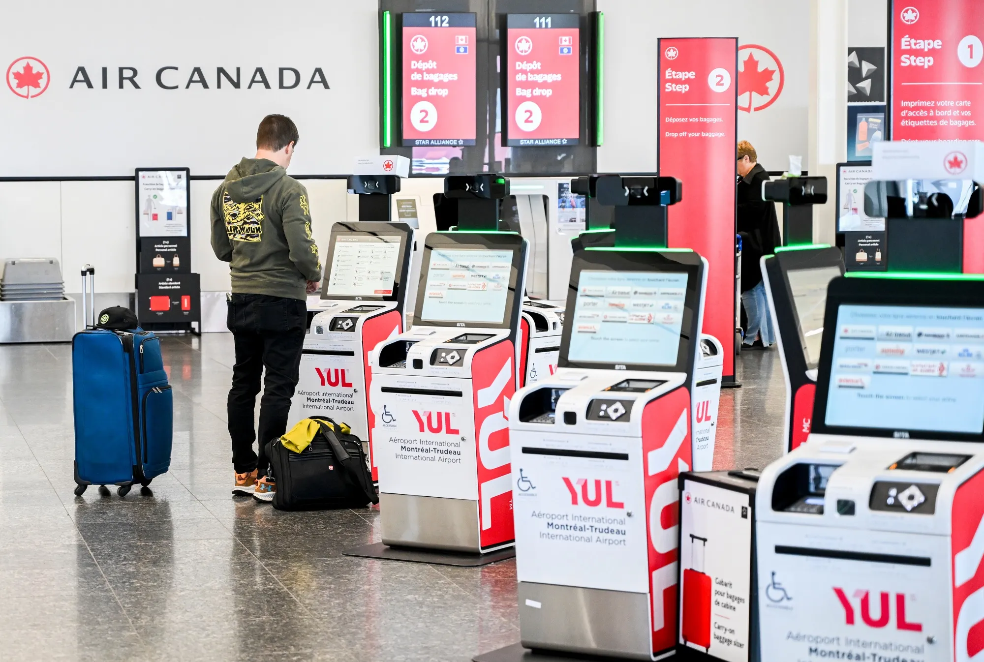 蒙特利爾機場加拿大航空自助值機櫃台前的旅客。