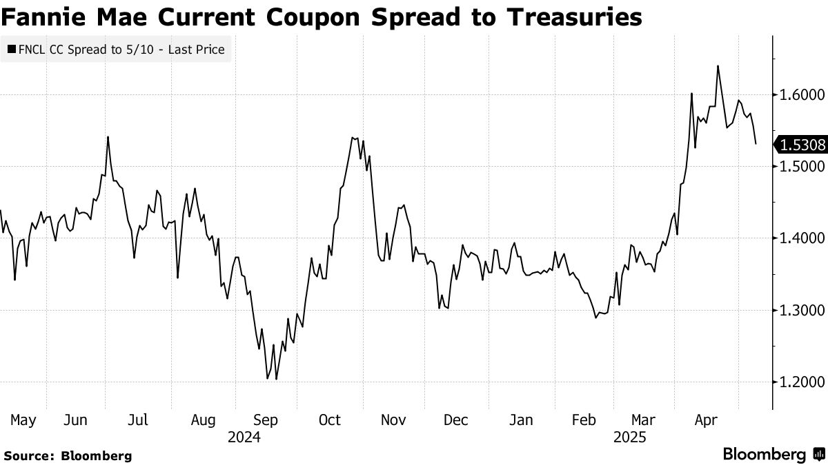 在特朗普關税聲明首次衝擊市場一個月後,美國銀行策略師本週早些時候指出,MBS風險溢價仍“居高不下”。高盛分析師本週也提到,儘管公司債券利差已有所回落,但MBS利差仍處於相對高位。