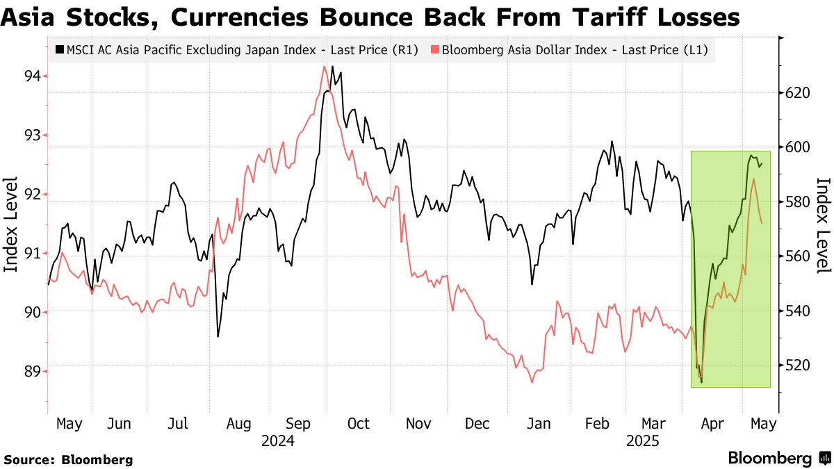 由於許多亞洲國家高度依賴與全球最大經濟體的貿易,特朗普4月初宣佈加徵關税的擔憂對亞洲金融市場打擊尤為嚴重。自那以來,它們的反彈得到了美元走弱的幫助,因為交易員押注關税將對美國經濟增長產生負面影響,並削弱海外對美國資產的需求。