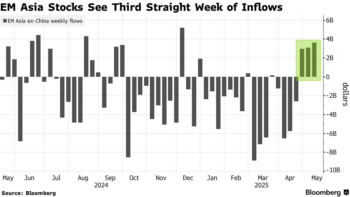 彭博彙編數據顯示,過去三週全球基金累計淨買入96.4億美元中國以外亞洲新興市場股票,創下自2024年3月以來最長的資金持續流入紀錄。