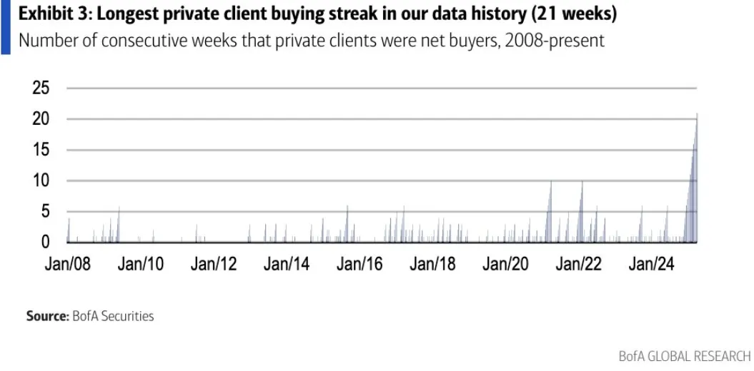 散户投資者似乎是唯一不受美聯儲或特朗普貿易政策影響的羣體。當2月下旬市場大幅拋售時,個人投資者買入,而機構投資者以接近創紀錄的速度撤出美股。在美國銀行,個人投資者客户截至5月2日已連續21周買入股票,這是該行自2008年以來數據記錄中最長的連續買入週期。
