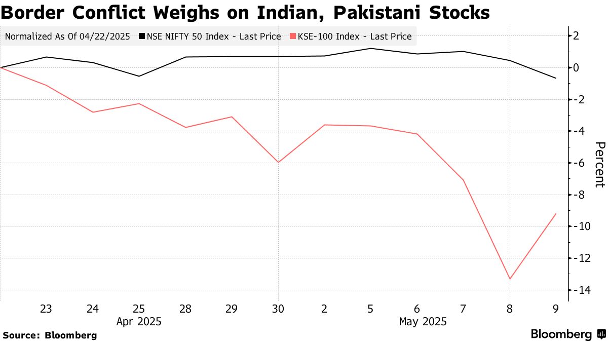 投資者此前一直神經緊繃。印度NSE Nifty 50指數週五下跌逾1%,創一個多月來最大跌幅,而盧比是上週亞洲表現最差的貨幣之一。隨着風險溢價擴大,債券收益率緩步攀升,不過印度央行的債券購買操作幫助限制了跌幅。自4月22日克什米爾襲擊事件引發印度報復以來,巴基斯坦基準股指已累計下跌9%。