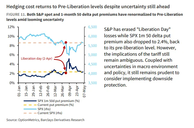 “理論上最有效的對沖是做空期貨,但難點在於精準把握平倉時機,”布拉克指出,“因此我們認為更實用的做法是利用當前隱含波動率水平(VIX指數現報22點左右),買入2025年12月到期、執行價100%-80%的看跌期權價差組合。”