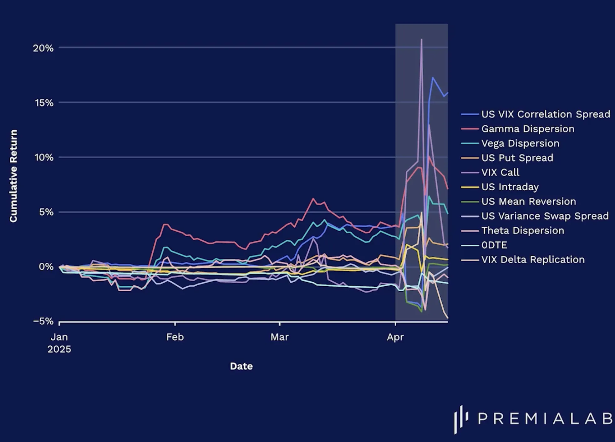 據報道,對沖基金在近期市場下跌期間積極參與波動率敲出期權交易,以利用更好的入場點——同時押注股票下跌和波動率降低。入場時機至關重要:4月1日建立的倉位可能迅速敲出,而1月1日建立的六個月期交易(取決於障礙水平)可能仍然有效。