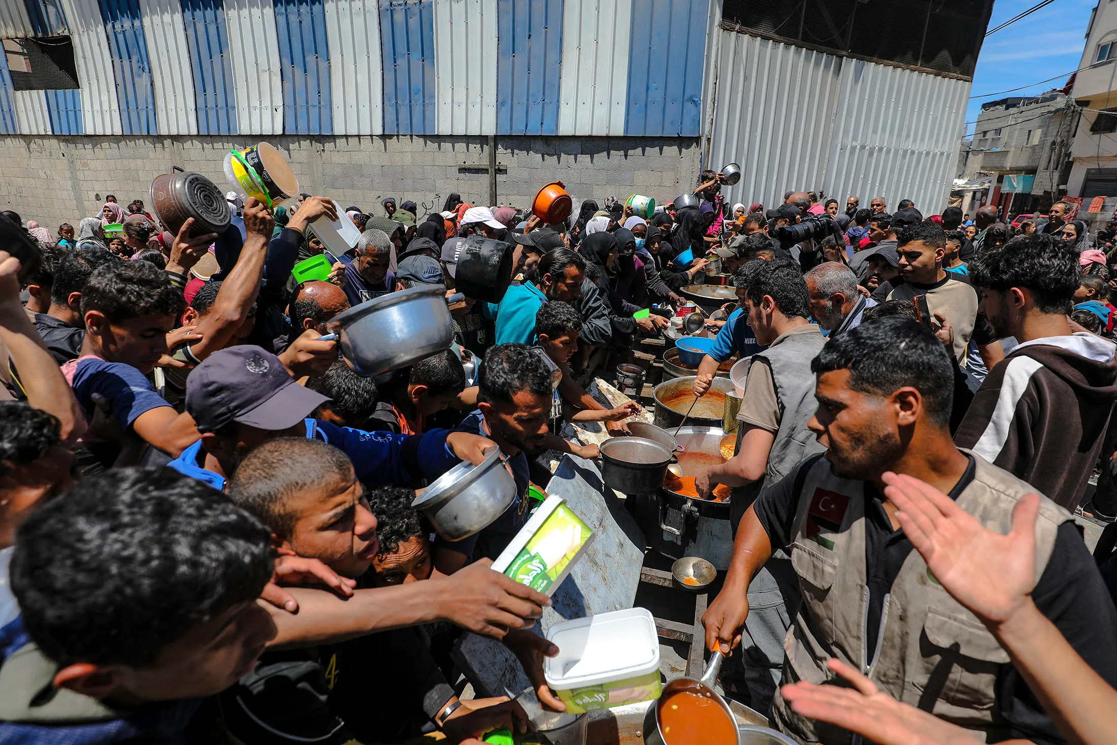 5月7日,加沙地帶一處食品分發點內流離失所的巴勒斯坦民眾。攝影師:Moiz Salhi/AFP/Getty Images以色列採納了美國總統唐納德·特朗普提出的分階段恢復加沙平民食品分發計劃,該計劃旨在防止物資被哈馬斯截獲。但具體啓動時間、資金來源及執行方尚不明確。