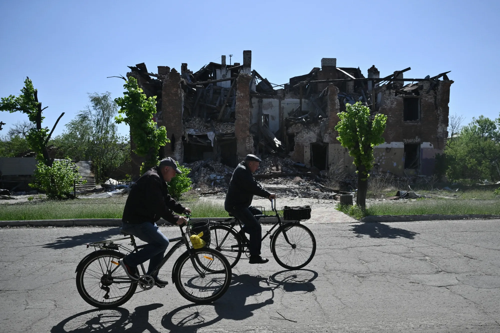 4月29日,當地居民騎着自行車經過頓涅茨克地區前線附近利曼鎮的一棟被毀建築。攝影師:Genya Savilov/AFP/Getty Images
