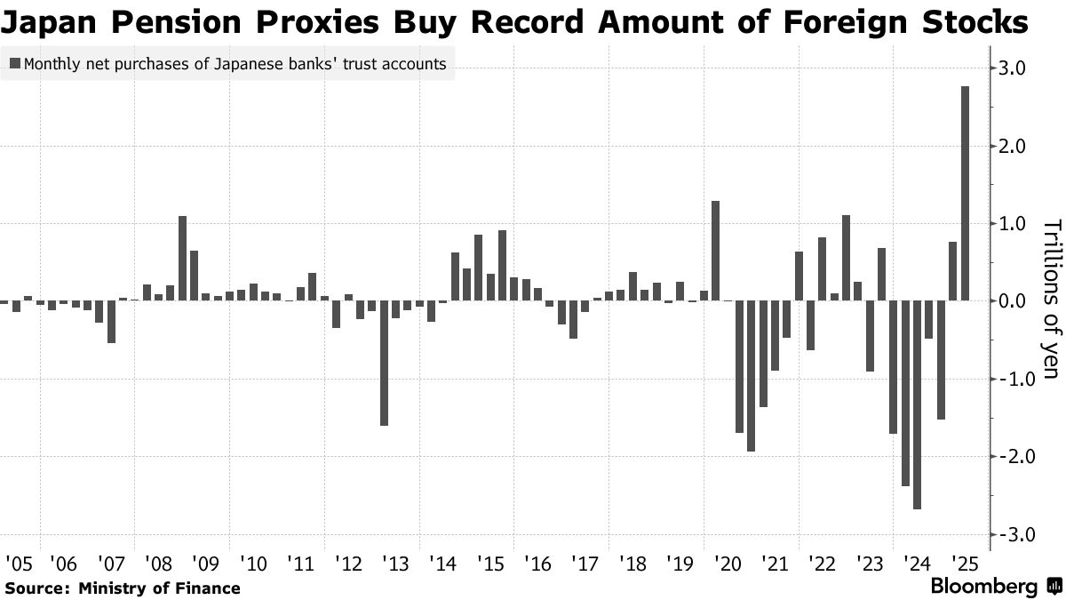 日本養老金基金的代理機構在4月份購買了創紀錄數量的外國股票,當時美國總統唐納德·特朗普所謂的互惠關税政策震動了全球市場。