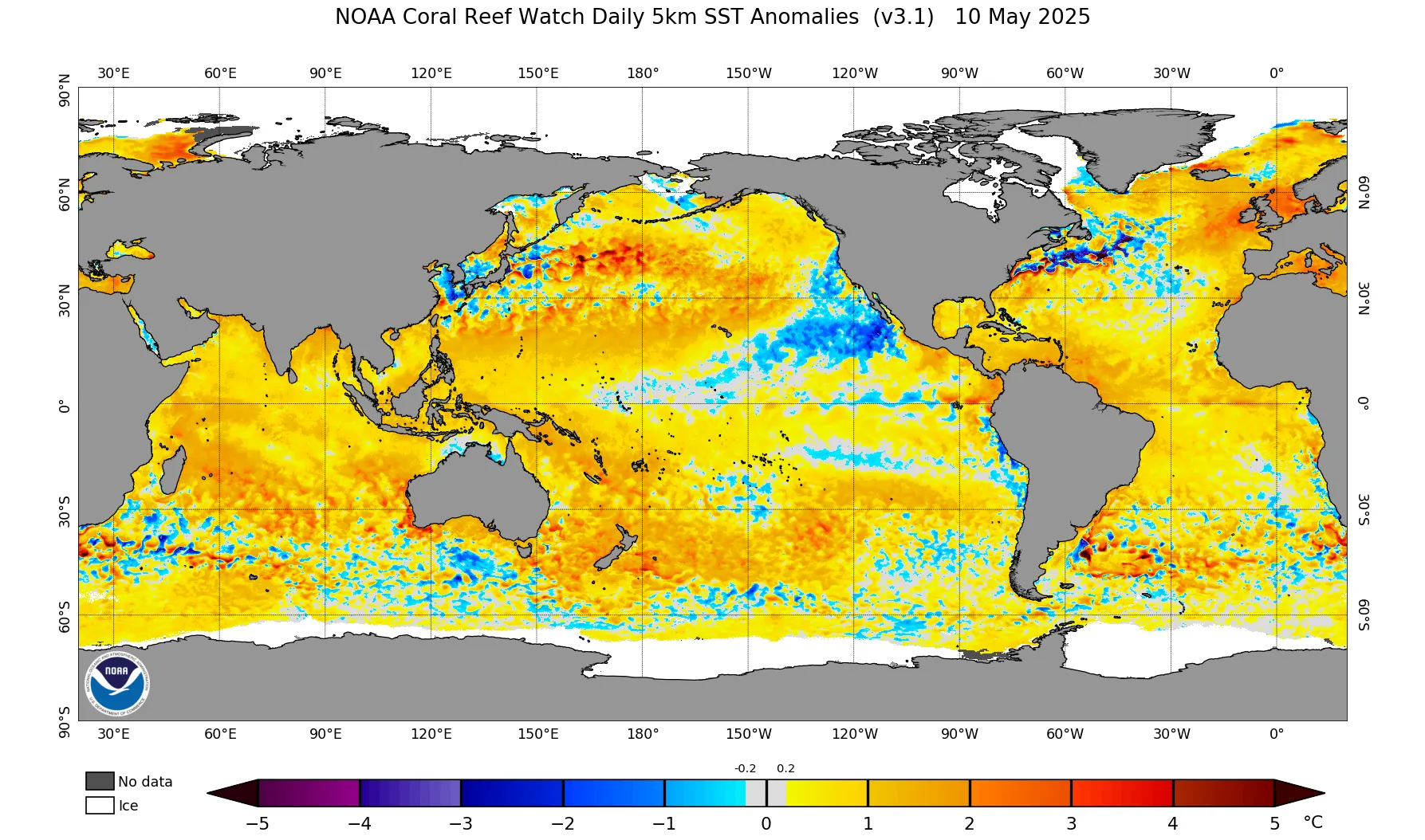 2025年5月10日海表温度異常情況。來源:美國國家海洋和大氣管理局這些大西洋暖流調節着英國全境的氣温——該國近期在經歷異常晴朗乾燥的天氣時創下高温紀錄。雖然造成這種天氣的主因是持續的高壓系統,但該區域海洋水温升高也會推升氣温,夏季尤為明顯。