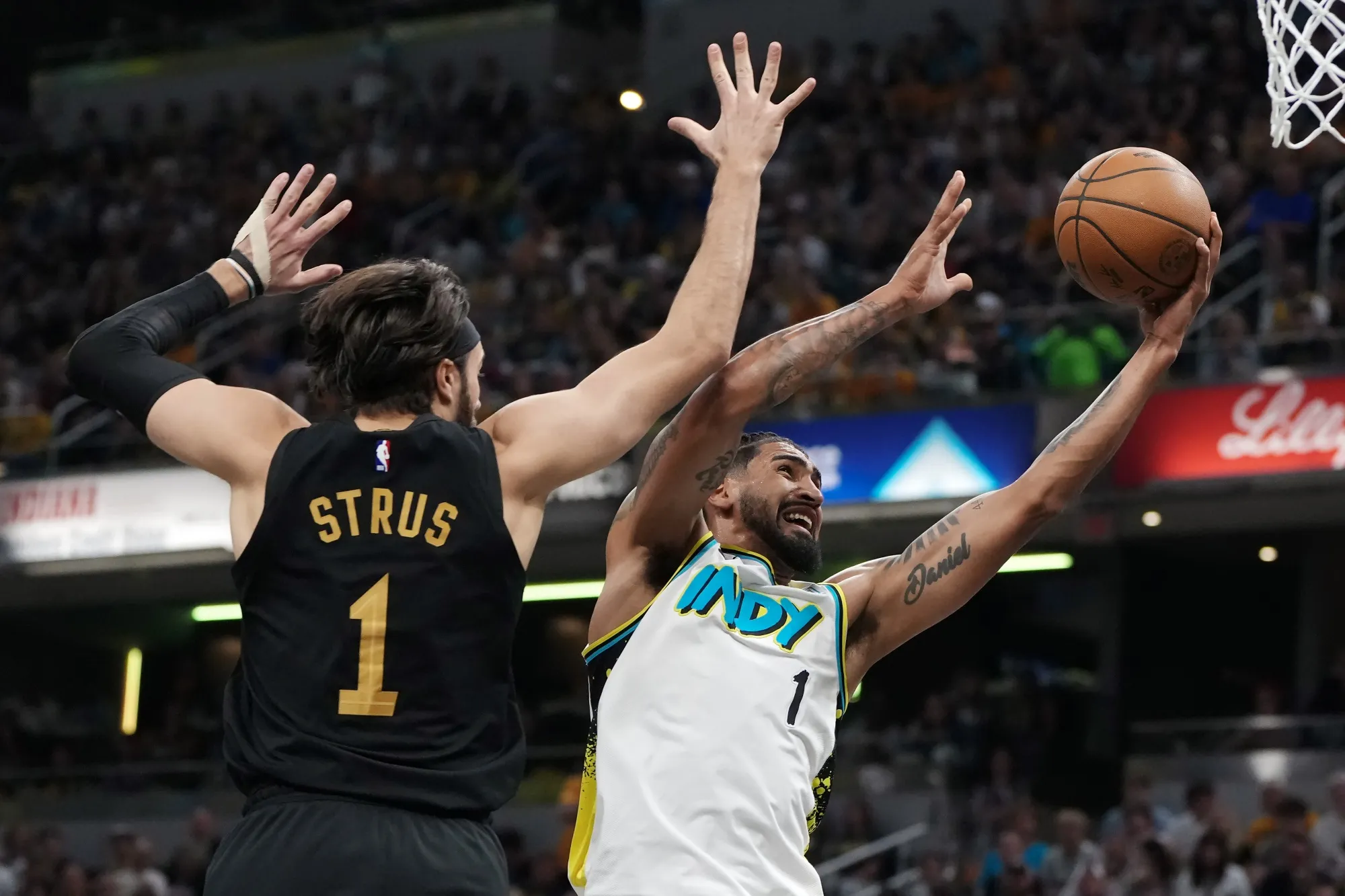 5月11日印第安納波利斯,步行者隊奧比·託平在騎士隊馬克斯·斯特魯斯防守下嘗試上籃。