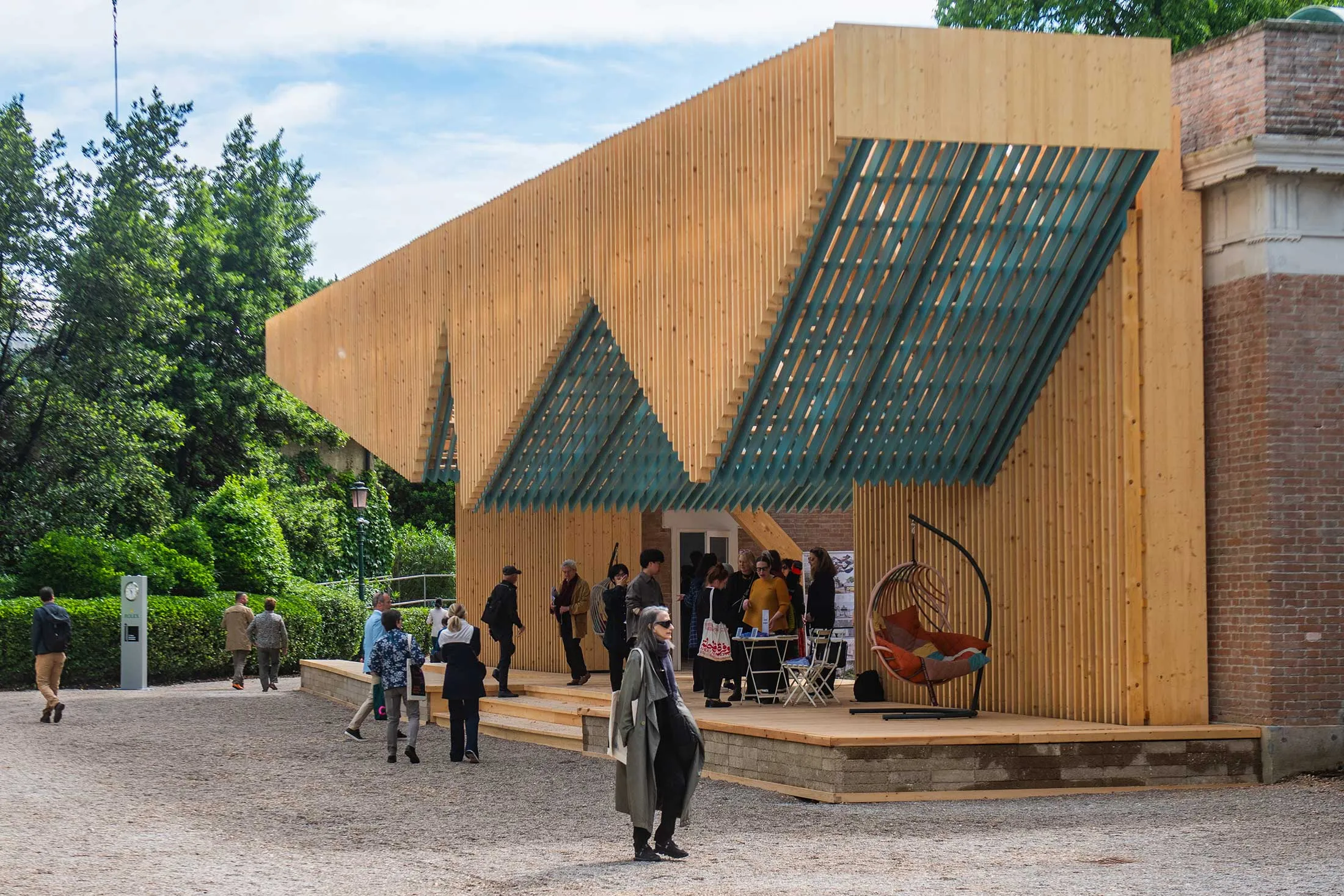 美國館聚焦前廊——這個在20世紀成為美式建築標誌性特徵的空間。策展團隊在這座95年曆史的展館建築前搭建了木質"門廊”,強調其作為室外公共街道與室內私密住所的過渡空間。“我們想讓人更好地理解這個’駐足、閒坐、交談、奏樂’的場所,“展館聯合專員蘇珊·秦告訴我。