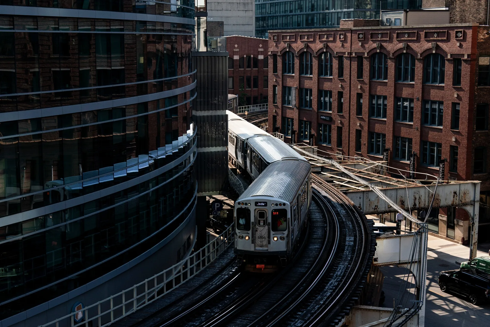 美國伊利諾伊州芝加哥市River North社區,一輛芝加哥交通管理局(CTA)的L線列車正在行駛。
