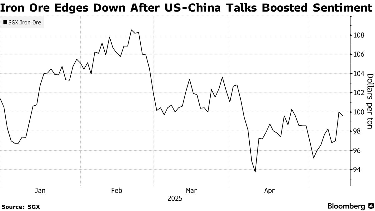 新加坡期貨價格跌向每噸99美元,週一曾飆升逾3%,收於近三週高位。這一上漲源於全球兩大經濟體宣佈大幅降低關税。