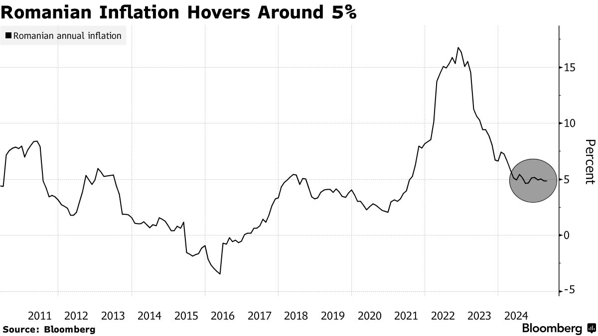 羅馬尼亞上個月的通脹率保持穩定,而自共產主義垮台以來最嚴重的政治危機導致列伊匯率跌至歷史新低,這可能會加劇價格壓力,並使央行在下個月貨幣政策上採取的觀望態度變得更加複雜。