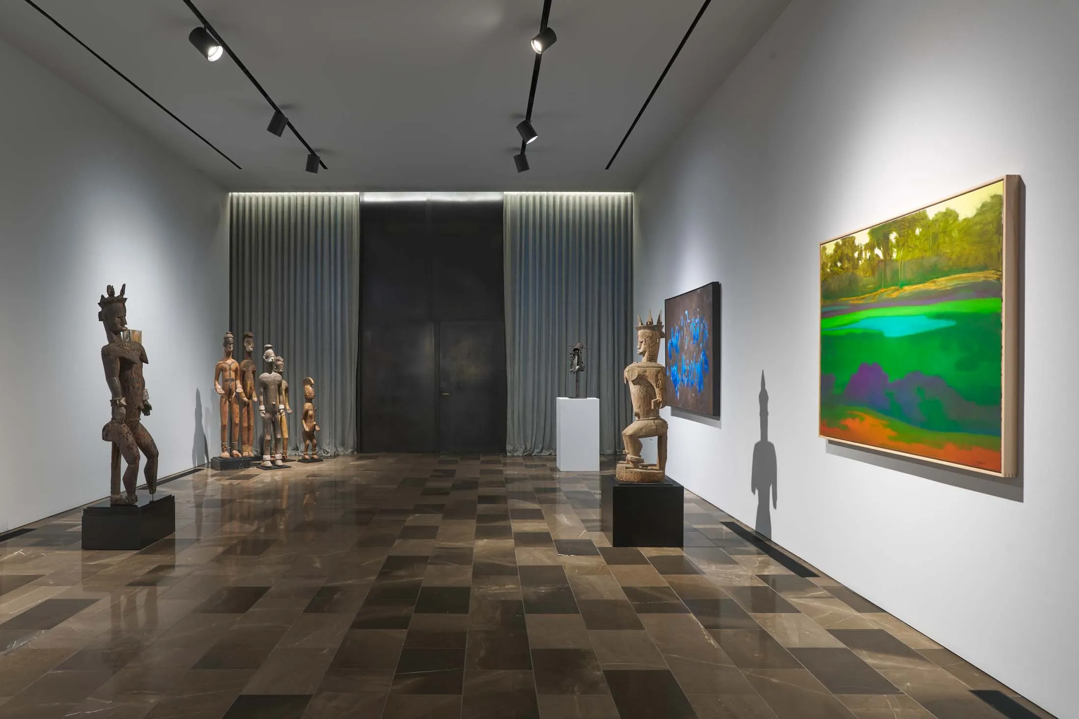 阿爾瑪·托馬斯1976年畫作《紅蔓玫瑰春之歌》(左)與山姆·吉列姆1967年油畫《微光》,共同簇擁着一尊烏爾霍博族男性雕像。圖片由亞當·林德曼(紐約)與伯納德·德格倫(布魯塞爾)提供林德曼的曼哈頓金星畫廊位於NoHo區大瓊斯街,他決定在自宅舉辦藝術展。“烏爾霍博+抽象”將震撼的非洲雕塑與當代藝術作品並置呈現。