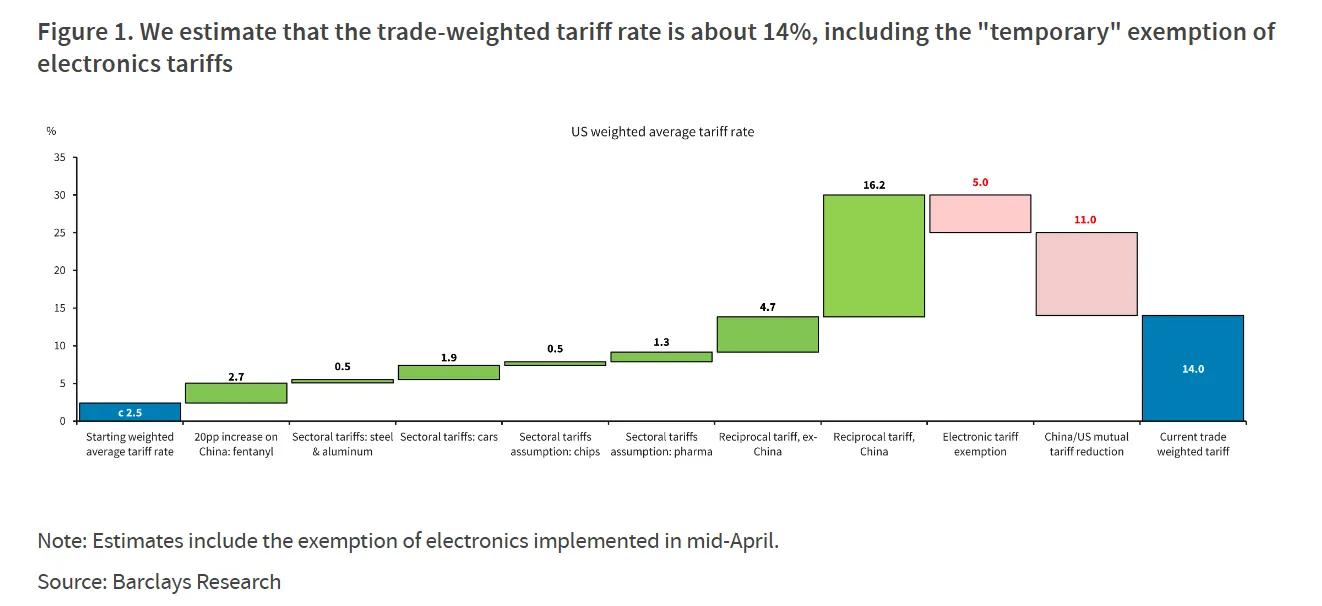 如果您和我一樣難以跟蹤關税現狀,巴克萊分析師馬克·詹諾尼和喬納森·米勒團隊提供的這張便捷圖表值得參考。他們估算,包括電子產品臨時豁免在內,當前美國貿易加權關税税率約為14%。分析師寫道:“這顯著低於過去一個月實施的大約25%(不含電子產品豁免則為30%)税率。”