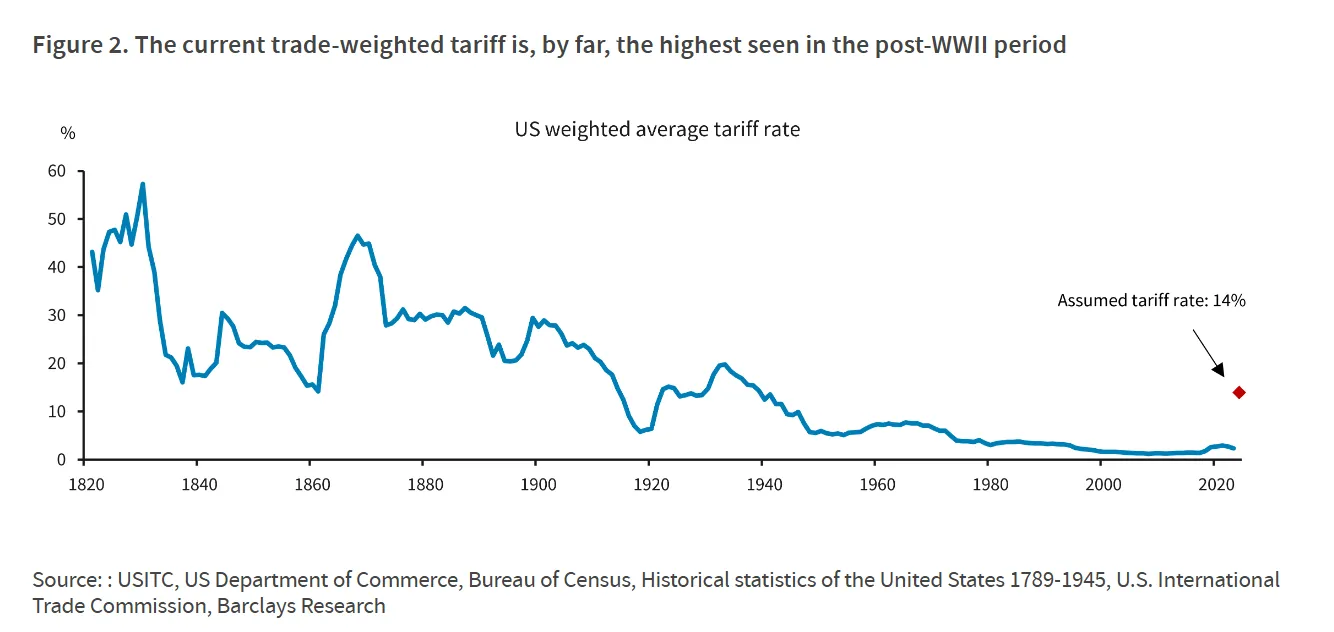 來源:巴克萊銀行來源:巴克萊銀行為了將其置於歷史背景中,這裏有一張我認為非常有趣*的圖表——同樣來自巴克萊銀行——展示了歷史上美國貿易加權平均關税水平。目前14%的税率仍遠高於二戰後平均水平。實際上,從圖表來看,即便在上週末的公告之後,我們幾乎接近了《斯姆特-霍利關税法案》級別的關税水平。