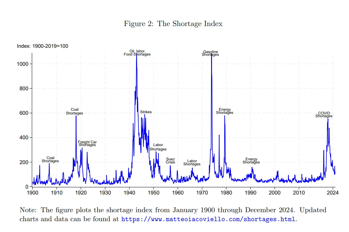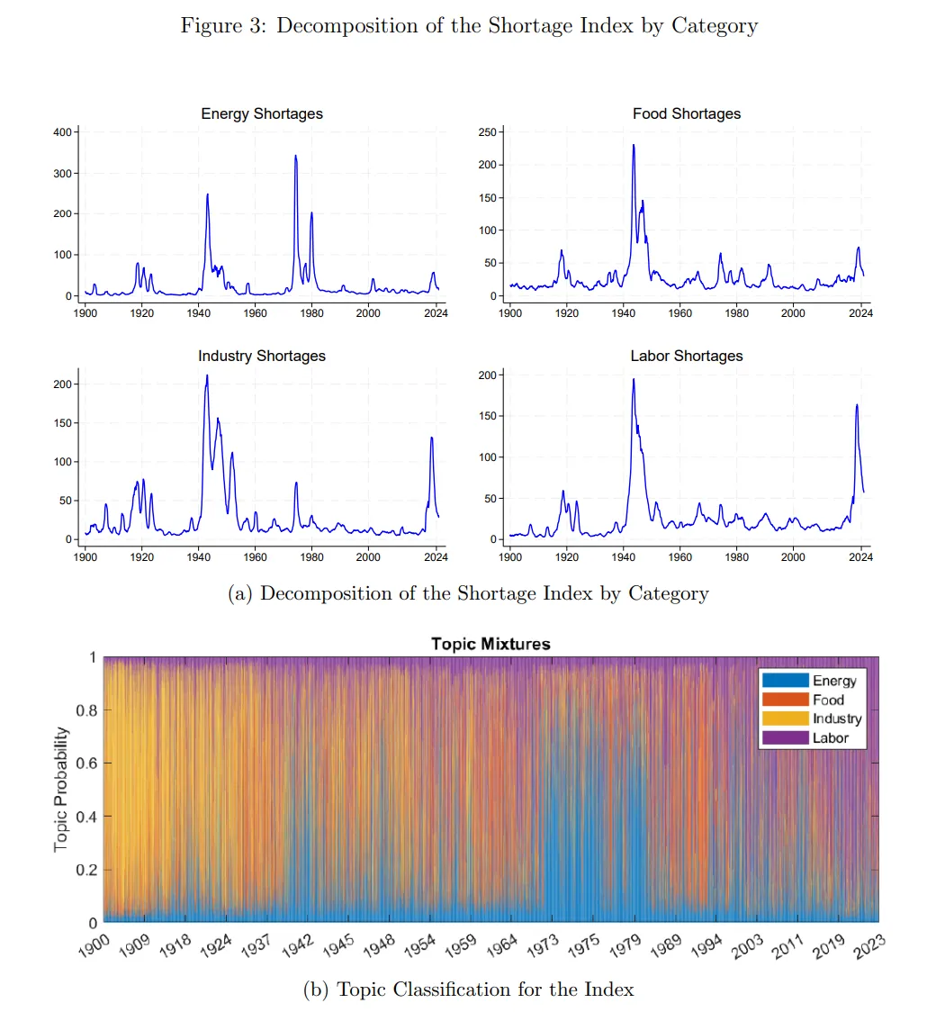 來源:巴克萊銀行來源:巴克萊銀行談到歷史背景,美聯儲發佈了一份有趣的討論文件,該文件通過分析1900年至新冠後時期的2500萬篇報紙文章,構建了一個月度短缺指數。這個指數最終成為了美國經濟史的一個相當有趣*的縮影: