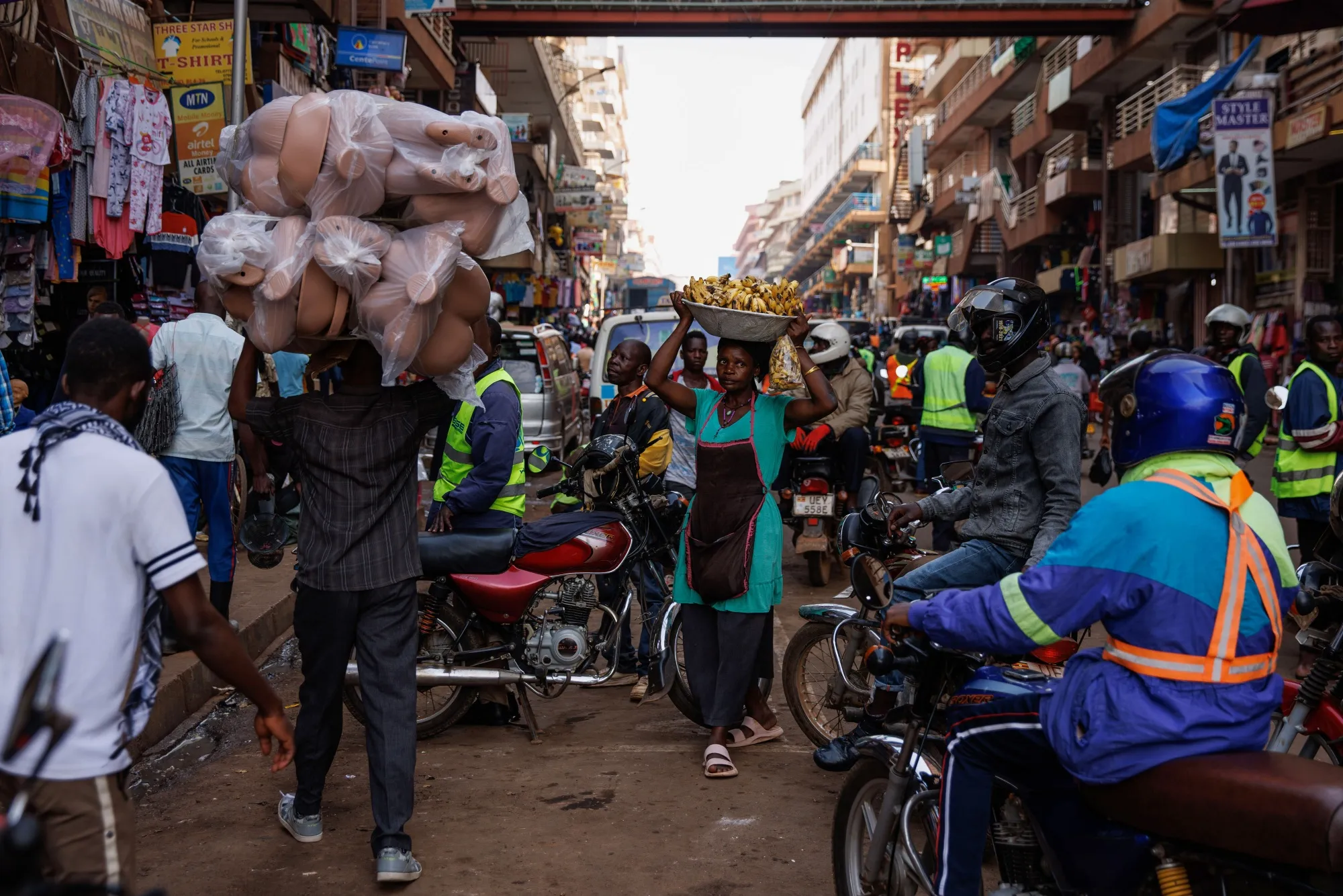 烏干達坎帕拉市中心商業街上,攤販們載着貨物從摩的旁經過。