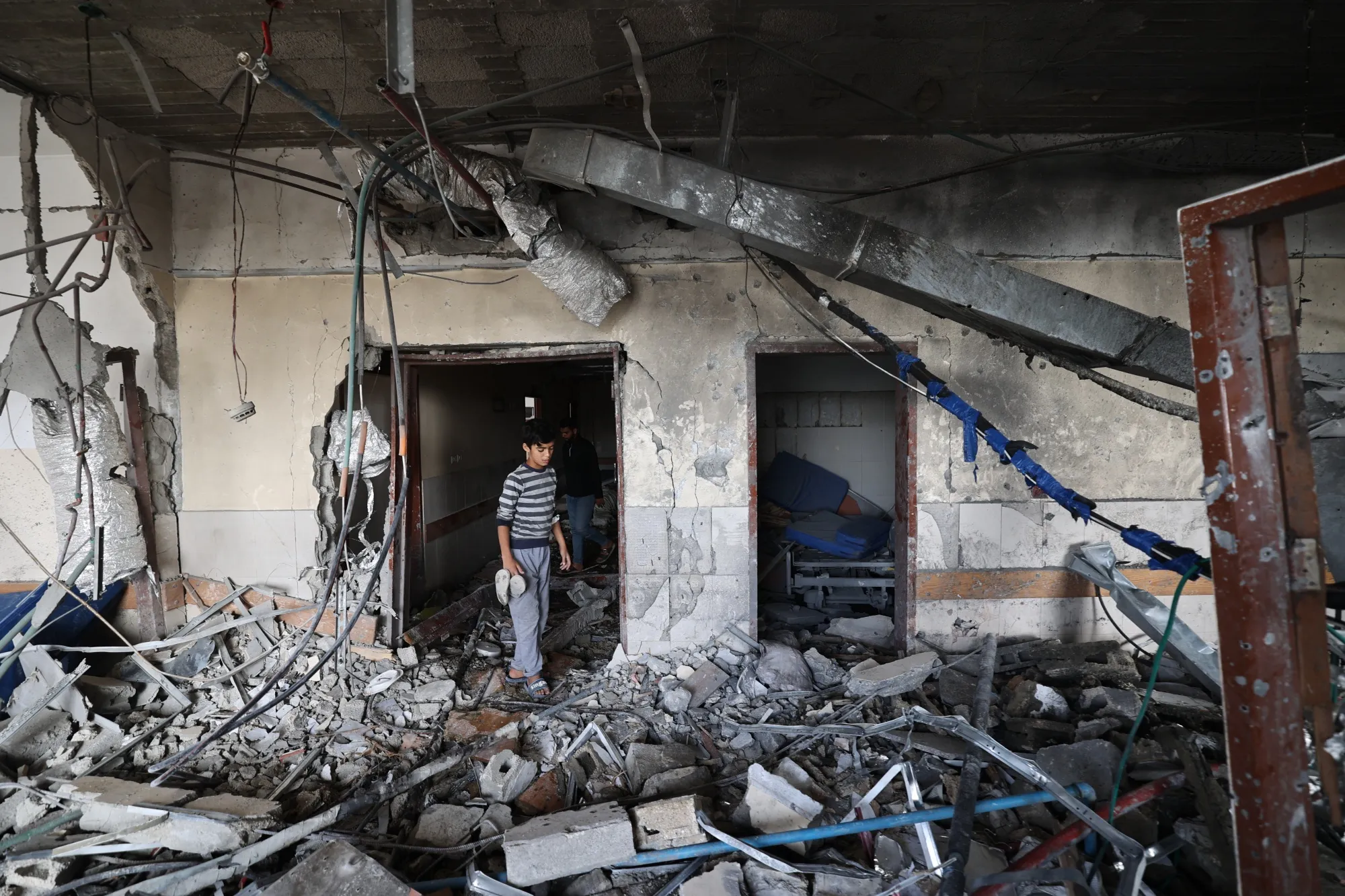 5月13日,一名居民查看汗尤尼斯納賽爾醫院內的損毀情況。攝影:Eyad Baba/AFP/Getty Images據哈馬斯控制的衞生部統計,加沙戰爭已導致超過5.2萬名巴勒斯坦人死亡,該地區大部分土地因以色列空襲及其他武裝衝突而淪為廢墟。以方則有400多名士兵陣亡。