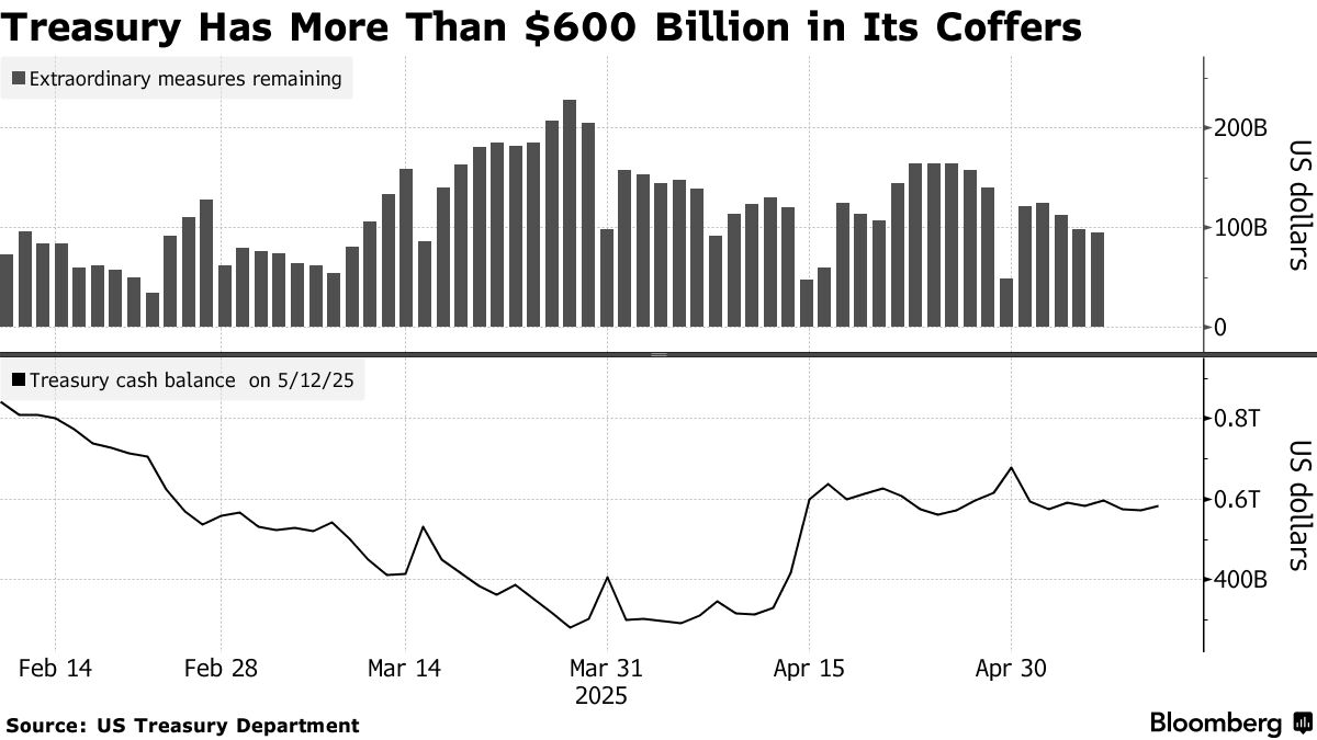 美國財政部上週表示,截至5月7日的數據顯示,除現金儲備外,財政部還剩餘950億美元特別措施可用於維持政府賬單支付。數據顯示,截至5月12日現金餘額為5830億美元。