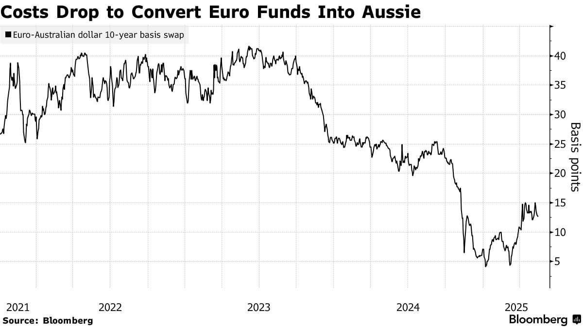 這家半政府機構還利用了更便宜的離岸融資成本。彭博彙編的十年期跨貨幣基差互換數據顯示,將歐元資金兑換為澳元的成本已降至約13個基點,較2023年年中42個基點的峯值顯著下降。