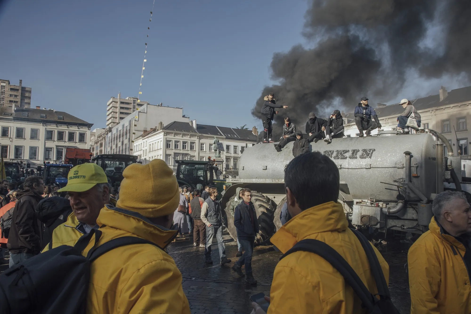 2024年2月布魯塞爾盧森堡廣場抗議活動中的農民。攝影師:西里爾·馬西拉西/彭博社在持續數月的抗議活動使歐盟農業政策受到嚴格審查後,歐盟將為農民提供更簡化的融資並放寬嚴格的環境法規。抗議活動。