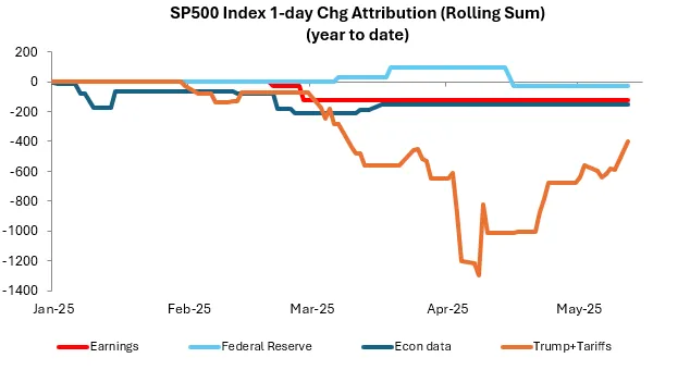 有兩點特別值得注意。首先,經濟數據對股價曾構成温和拖累,但隨着貿易新聞升温已基本消退。其次,在特朗普"解放日"聲明後,我們不僅收復了股市失地,但貿易新聞仍對股價造成淨負面影響。