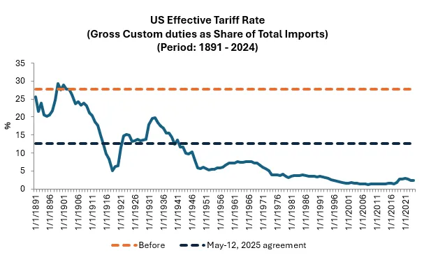 首先,關税將長期存在。實際關税税率仍處於高位。雖然估算數據眾多,但我計算得出實際税率下降約15個百分點至13%左右,仍處於歷史高位。