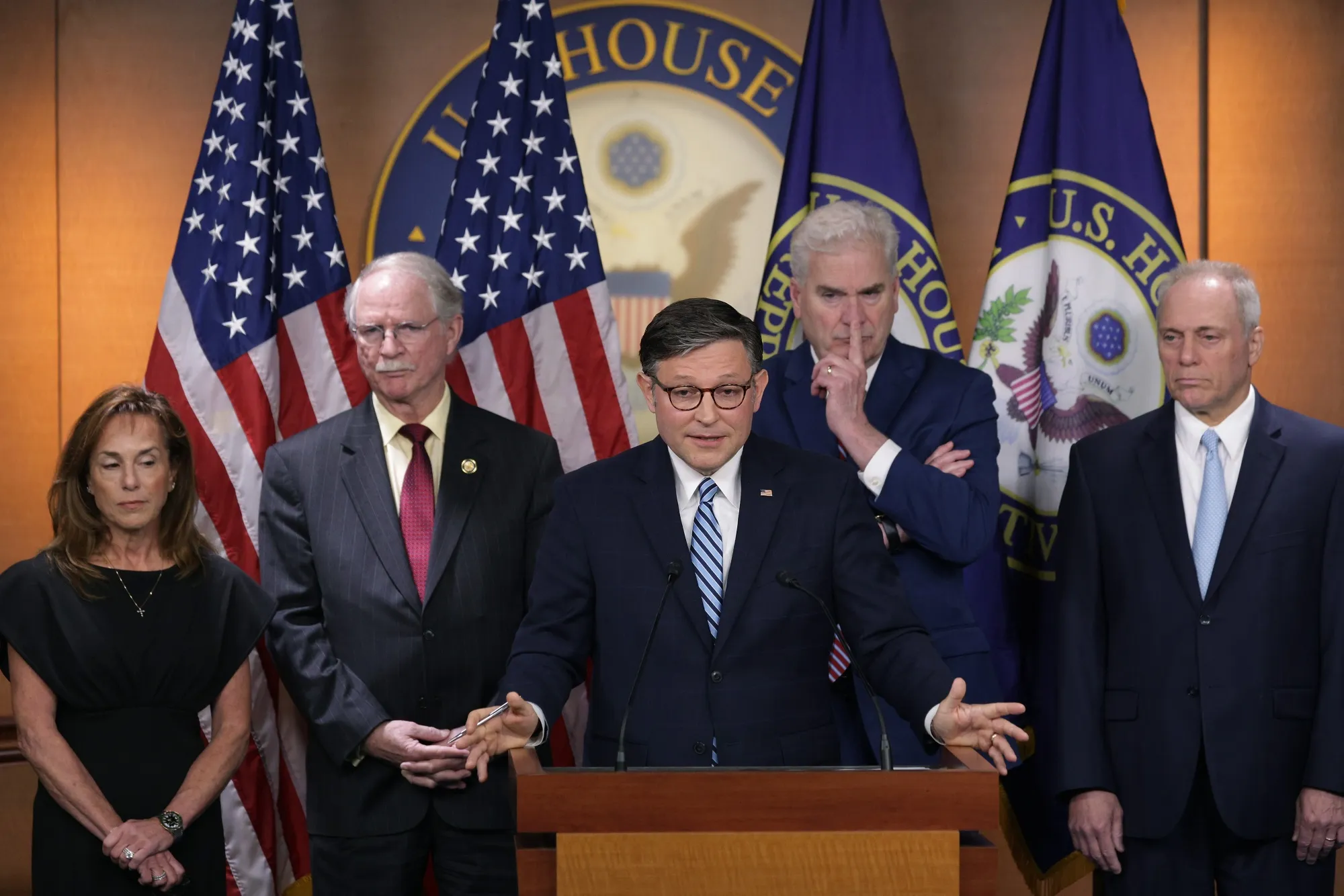5月14日,華盛頓特區美國國會大廈舉行的新聞發佈會上,邁克·約翰遜發言時,從左至右分別是麗莎·麥克萊恩、約翰·盧瑟福、湯姆·埃默和史蒂夫·斯卡利斯在聆聽。攝影師:亞歷克斯·王/蓋蒂圖片社儘管唐納德·特朗普總統數月來一直主張取消附帶權益税收優惠——美國税法中最具爭議的漏洞之一,但國會共和黨人提出的“宏大而美好”税收方案草案中,該條款仍維持原狀。