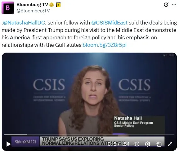 今天下午1點在彭博電視台的權力平衡早間版節目中,主持人喬·馬修和凱莉·萊因茨採訪了戰略與國際研究中心中東項目的高級研究員娜塔莎·霍爾,討論了特朗普的中東之行以及他對敍利亞的示好。
