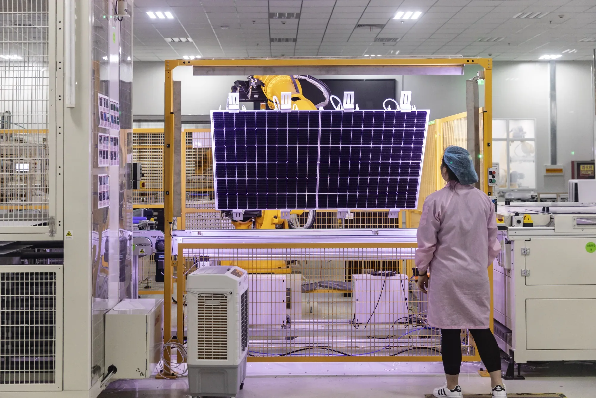 中國陝西省西安市某太陽能板工廠內,一名員工正在檢查光伏組件。