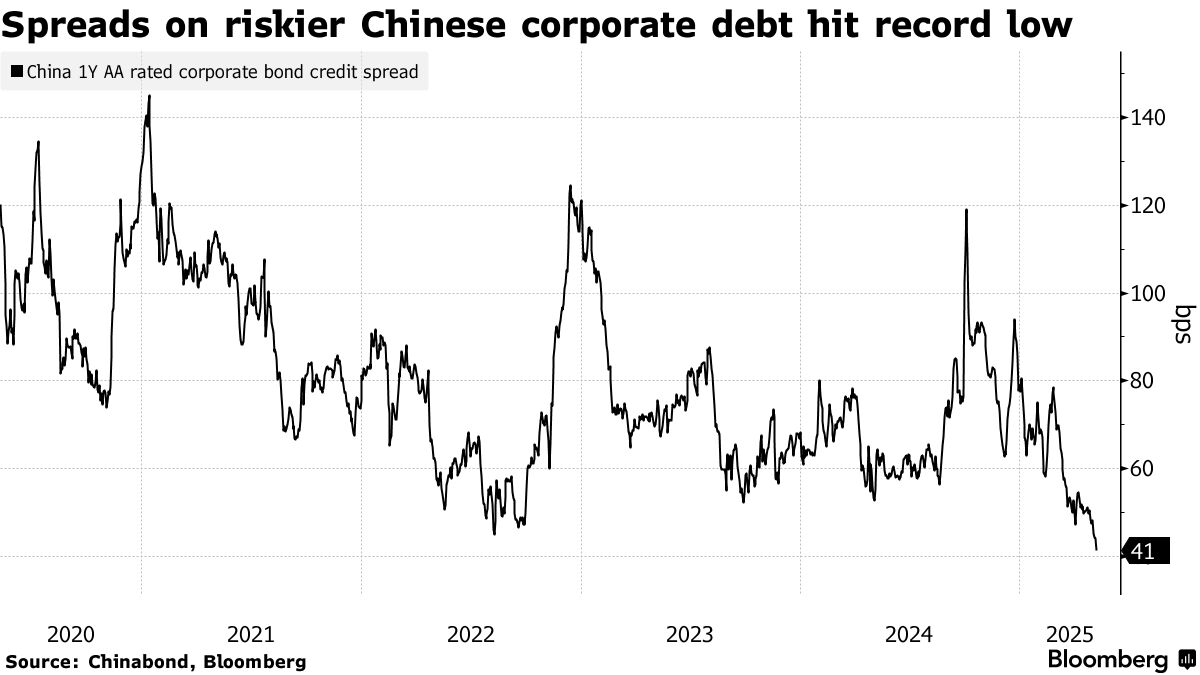 一年期AA級境內公司債收益率僅比同期限國債高出41個基點,使這一所謂信用利差收窄至2007年彭博開始編制該數據以來的最低水平。AAA級公司債及銀行常用融資工具同業存單的風險溢價,同樣創下2022年以來最窄紀錄。