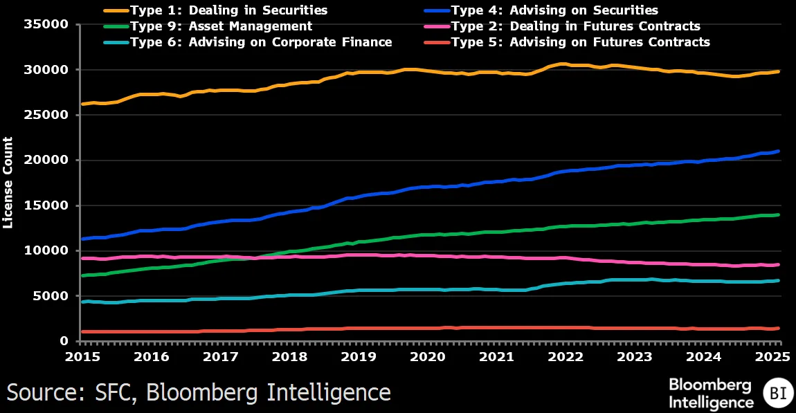 彭博行業研究分析顯示,投行就業形勢改善(2月份相關崗位較2023年底增長0.5%)的同時,財富和資產管理崗位也在增加。根據香港證監會數據,自2023年以來,財富管理、私人銀行及家族辦公室的牌照數量增長約5%,而證券期貨交易牌照數量基本持平。