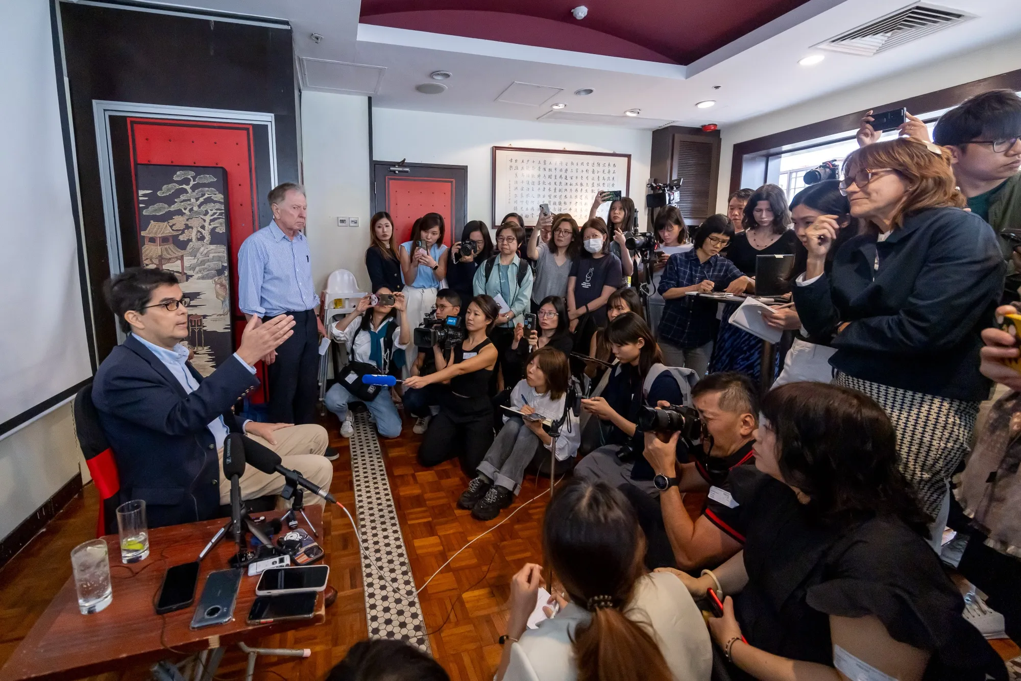 維權投資者大衞·韋伯在外國記者俱樂部舉行"告別爐邊談話"後接受媒體採訪。閲讀相關報道。攝影師:保羅·楊/彭博社### 新聲音活動