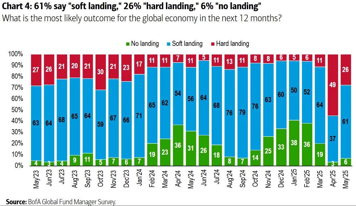 當前最緊迫的風險已從滯漲(若關税維持懲罰性水平可能成真)轉向通脹。近期經濟軟着陸論調已然過時,美國銀行基金經理調查顯示,在關税風波期間,“不着陸"情景(即經濟過熱、通脹失控最終迫使利率進一步攀升)的預期幾乎消失。可以預見此類概率將大幅回升: