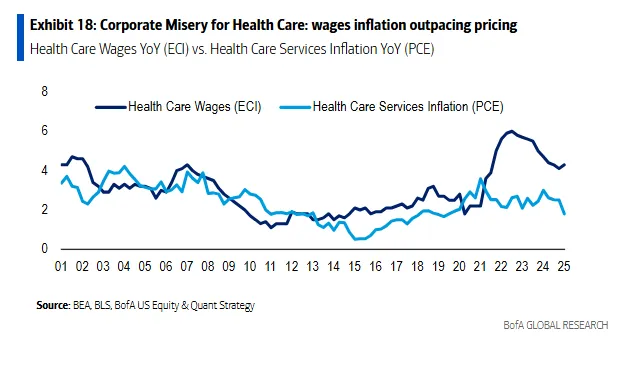在此背景下,市場擔憂突然從經濟衰退轉向過熱,這正是醫療股最不願看到的情況。至於利潤率面臨的長期壓力,盧茨指出該行業工資漲幅已超過物價上漲。勞動力成本佔醫院、家庭護理和臨終關懷機構支出的最大比重,因此成為盈利能力的核心變量: