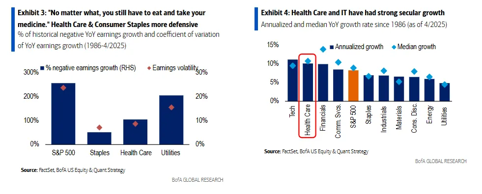 美國銀行分析師艾倫·盧茨指出,除政治不確定性外,醫療保健和科技行業還面臨特殊風險。歷史數據顯示,當一個行業陷入困境時,另一個行業往往會吸引資金流入。下圖顯示經濟前景惡化時醫療保健板塊表現更優: