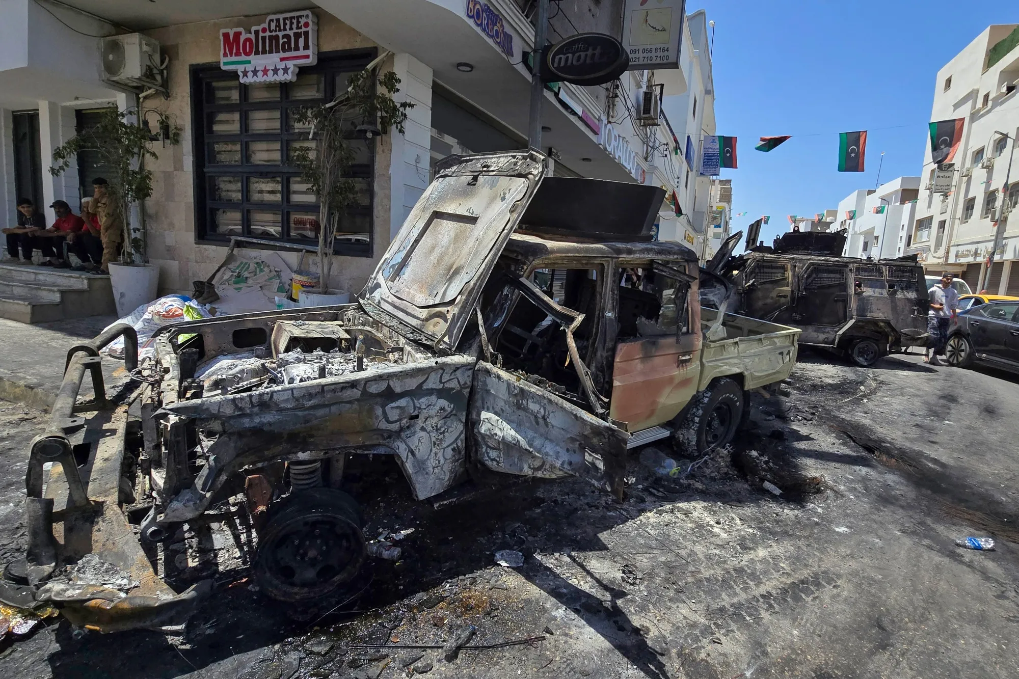 5月13日,的黎波里夜間衝突後損毀的車輛。攝影師:Mahmud Turkia/AFP/Getty Images利比亞首都正經歷多年來最嚴重的武裝衝突,隨着政府對敵對民兵組織實施打擊,人們擔憂這個北非國家將陷入大規模衝突。