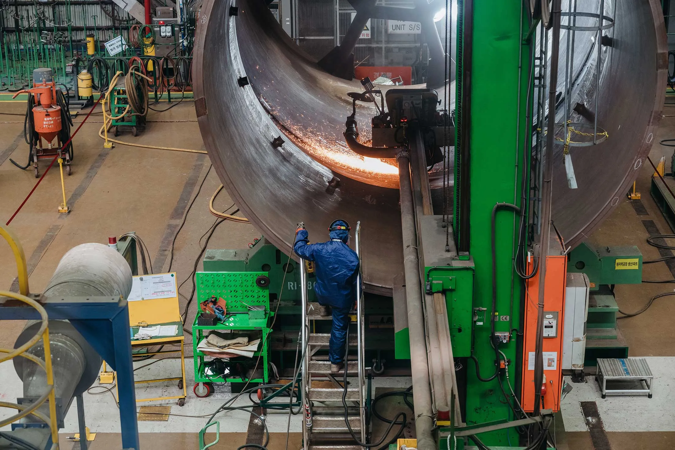 一名工人監督自動化機器打磨核反應堆蒸汽發生器內表面。攝影師:Jun Michael Park(彭博商業週刊)在韓國港口城市昌原,一座八層樓高的機器正晝夜不停地運轉,以24萬人力的力量壓制着燒得通紅的巨型鋼坯。斗山能源公司的這台鍛壓機——全球同類型設備中最大型的——將熾熱嘶鳴的金屬鍛造成船舶軸件、軋鋼廠輥筒等全球工業的基礎構件。