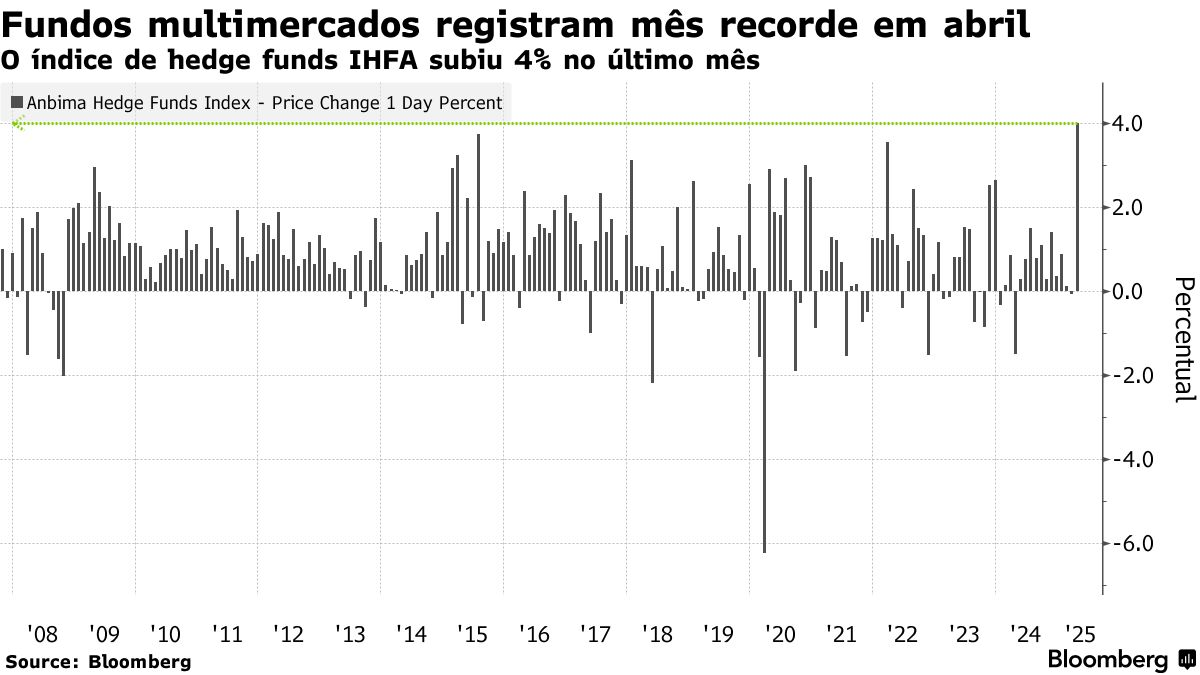 由巴西資本市場協會Anbima編制的IHFA對沖基金指數上月上漲4%,創下自2007年底數據監測以來的最佳表現。同期CDI基準利率僅上升1.1%——這是自2024年11月以來本地多市場基金首次跑贏基準。