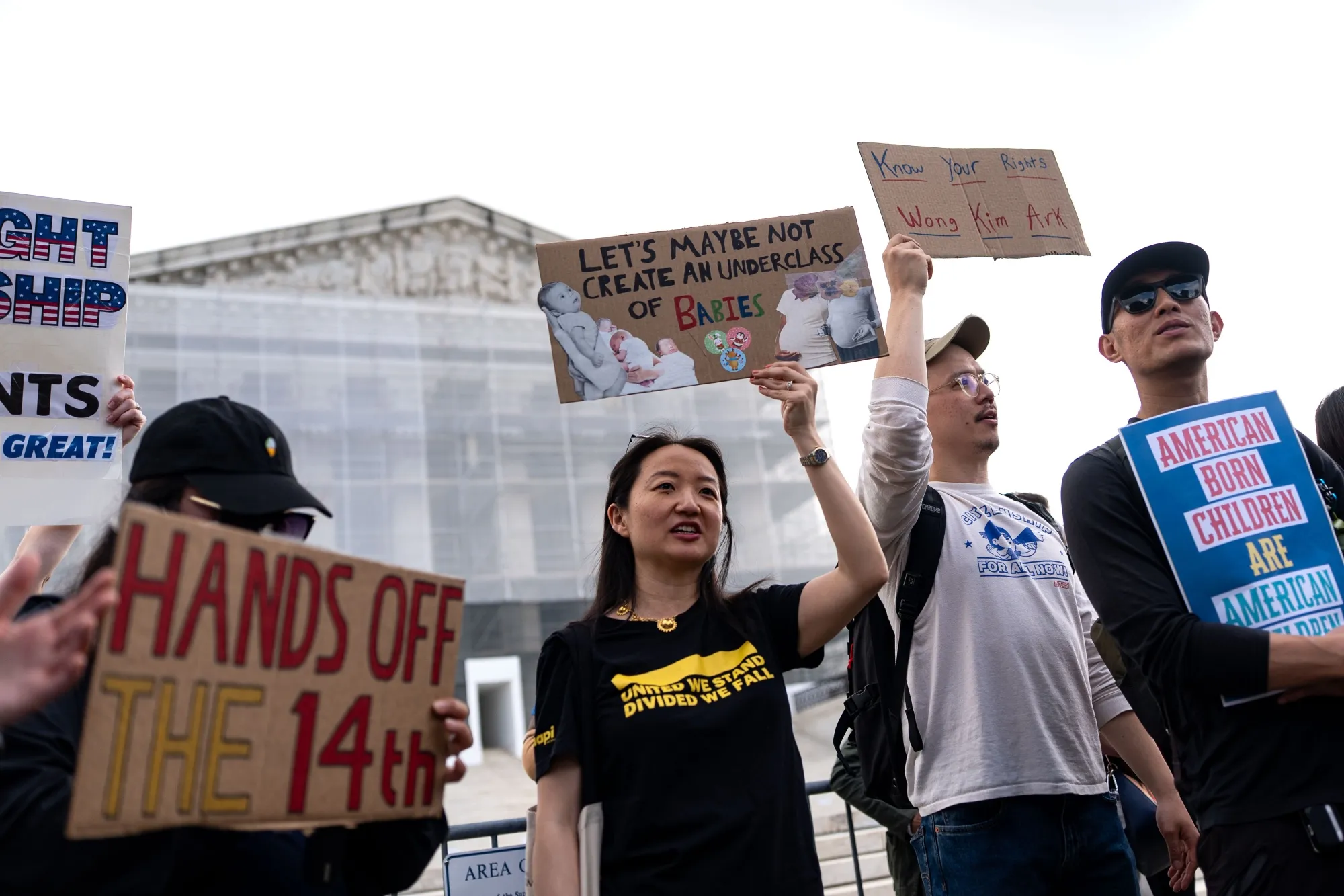 5月15日華盛頓最高法院口頭辯論期間,法院外的示威者。攝影師:Kent Nishimura/彭博社特朗普1月20日旨在推翻長期憲法權利的行政命令原計劃在30天內生效。政府表示,三位在全國範圍內阻止該政策的聯邦法官本應將其命令限制在訴訟相關方範圍內。