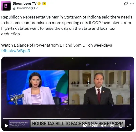 今日下午1點彭博電視《權力平衡》早間節目中,主持人喬·馬修與凱莉·萊茵茨採訪了印第安納州共和黨眾議員馬林·斯圖茨曼,探討共和黨減税法案懸而未決的問題及總統解除對敍制裁的承諾。