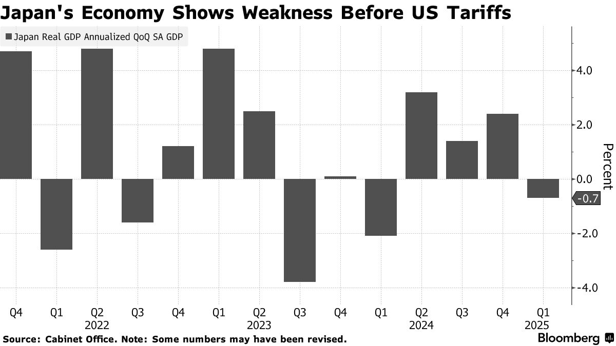 根據日本內閣府週五發佈的報告,經通脹調整後的國內生產總值在今年前三個月按年率計算收縮了0.7%。這一結果略遜於經濟學家預估中值(預計萎縮0.3%),且根據美國關税的衝擊程度,日本經濟本季度可能陷入技術性衰退。